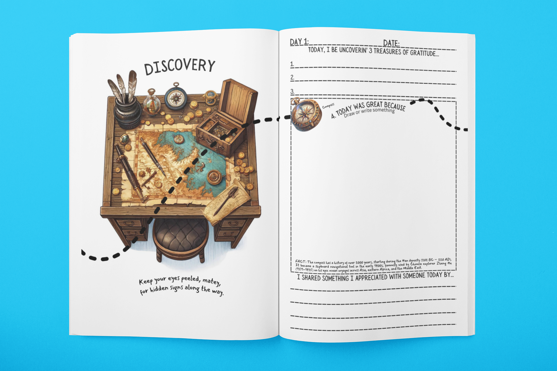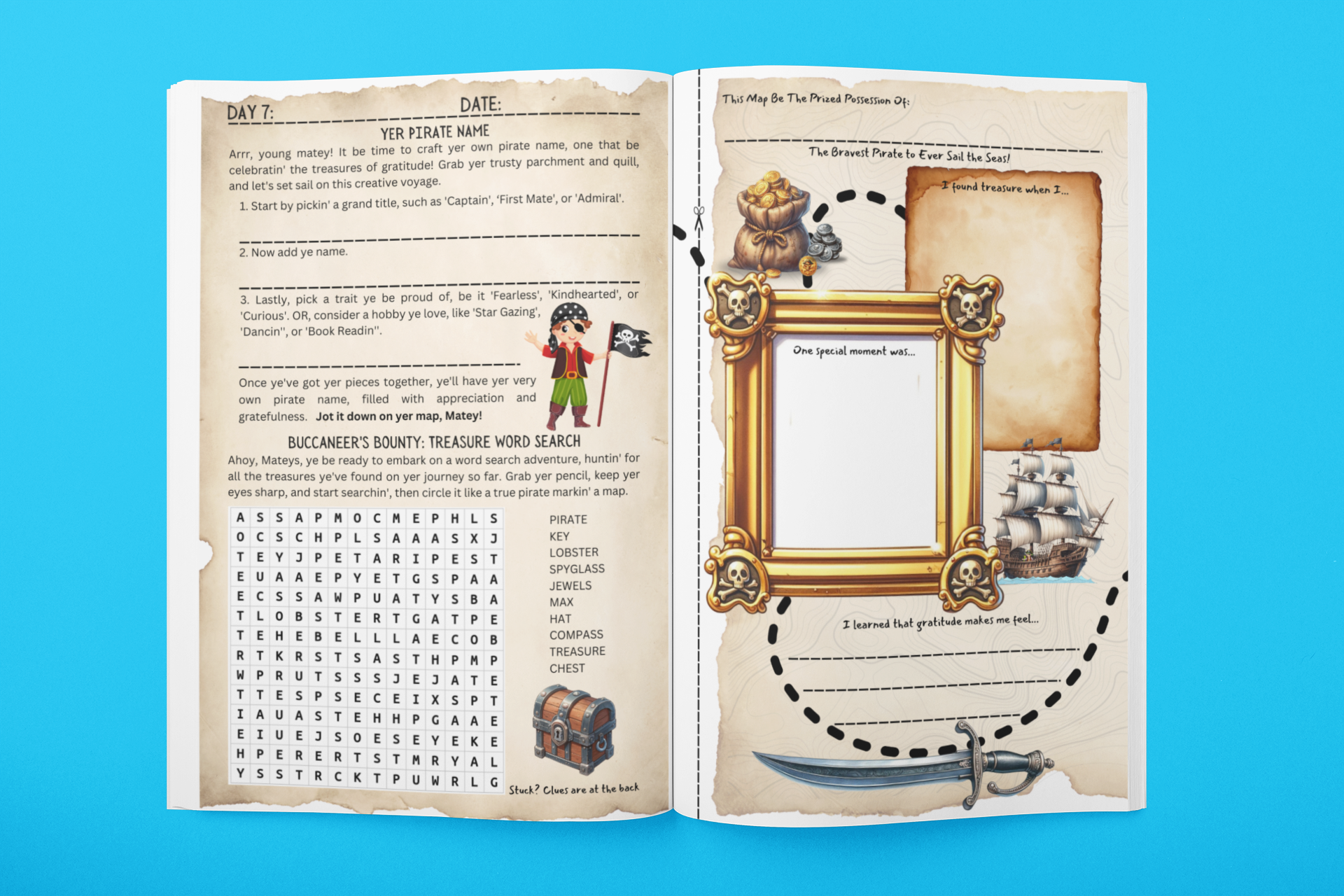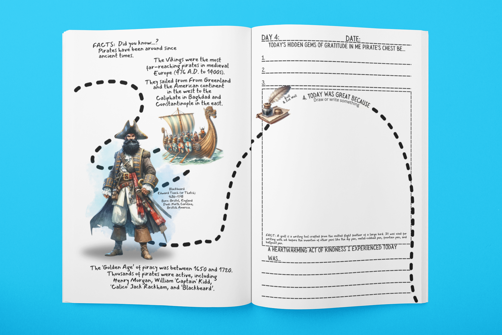 Teach children mindfulness & practice gratitude with fun pirate-themed prompts and educational facts about The Golden Age of Piracy.