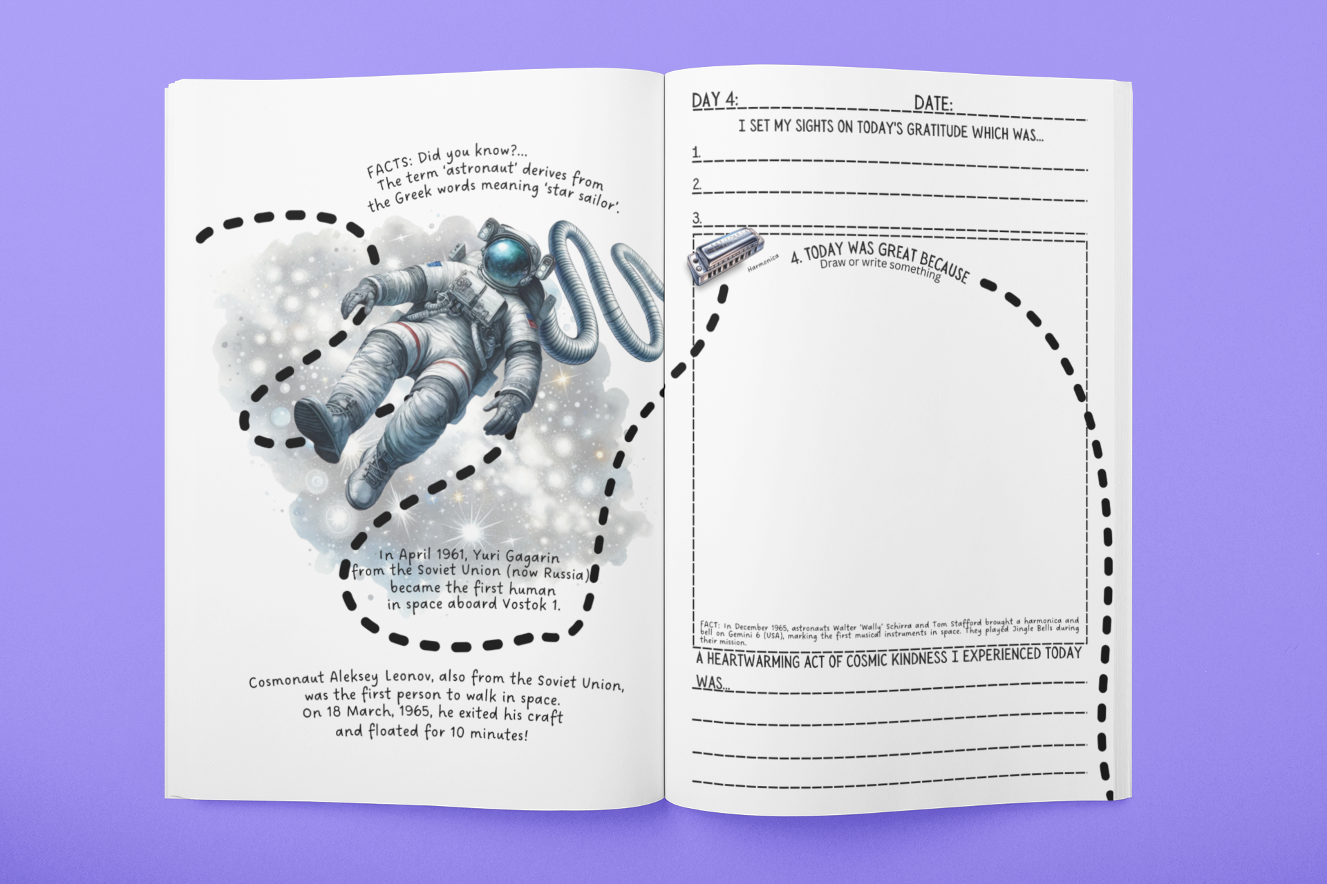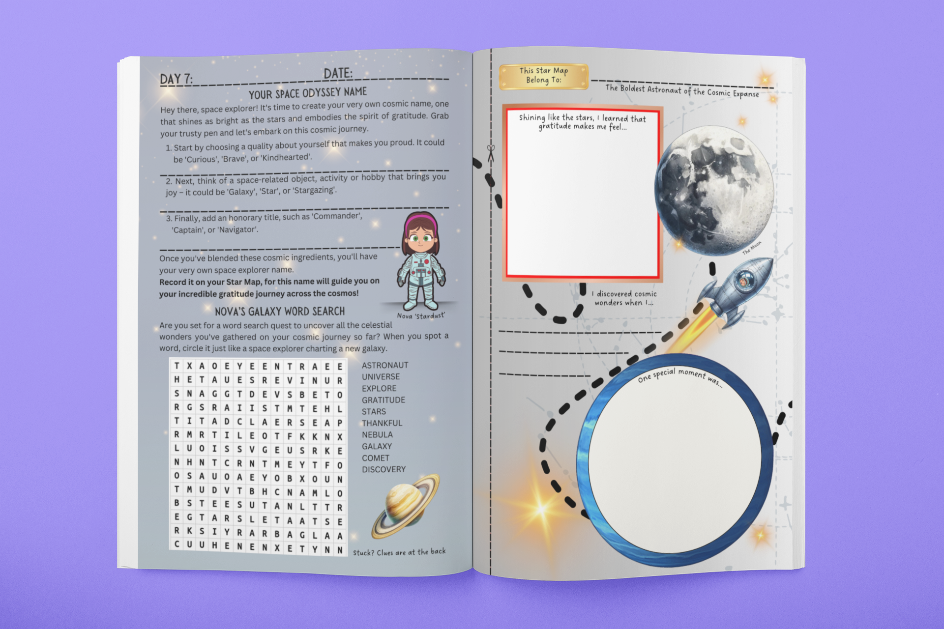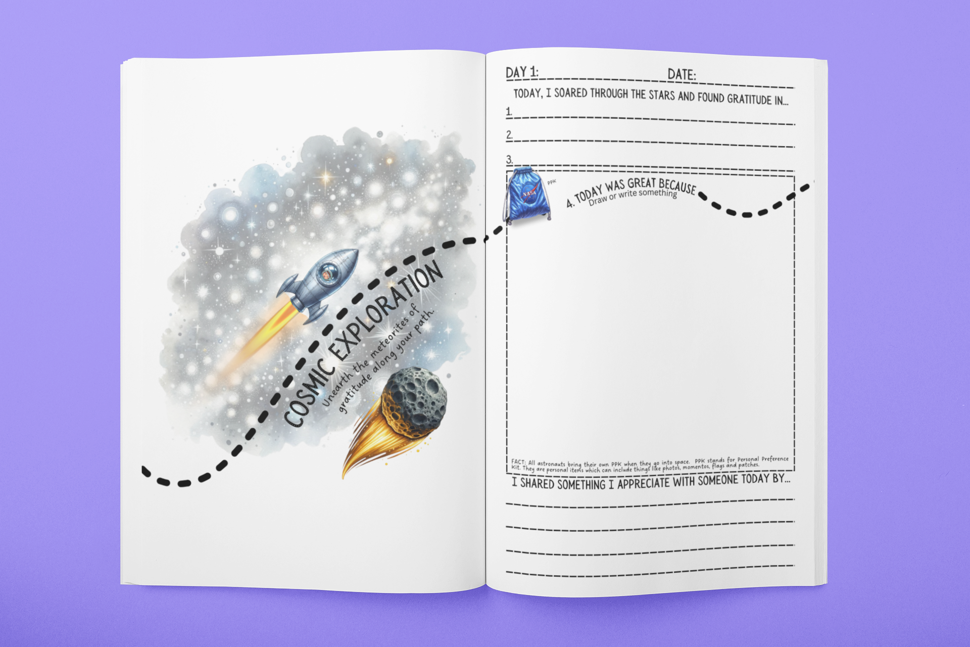 A fun space themed gratitude journal to teach children mindfulness & practice gratitude.