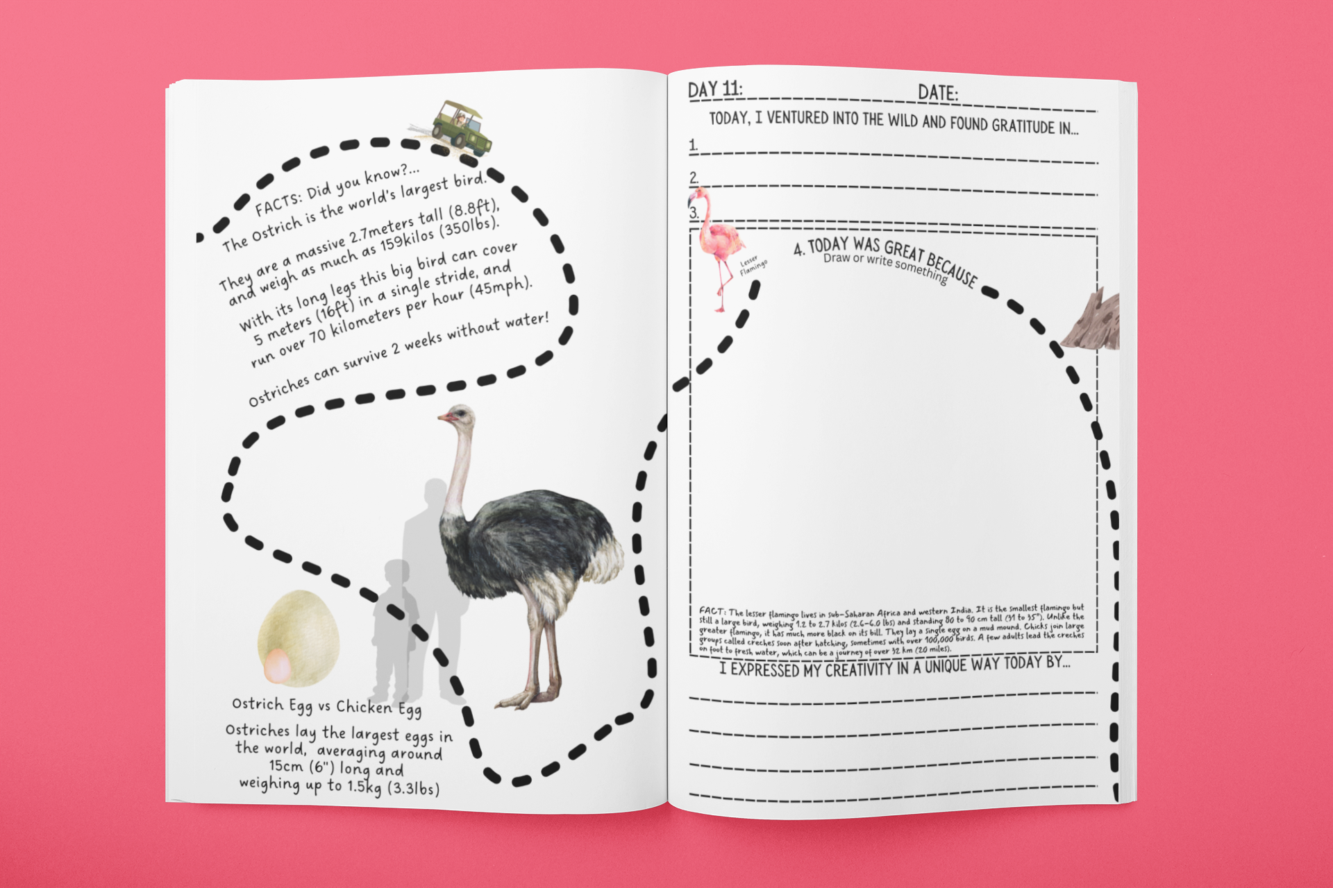 Each day offers new and exciting prompts with 70 days of adventure & discovery and educational facts about the African Savanna!