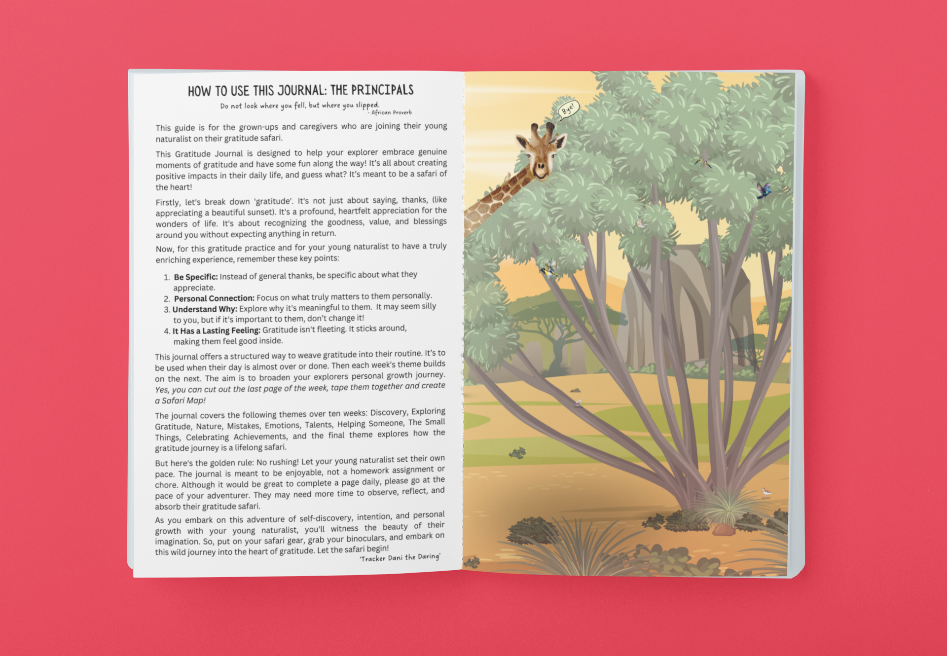 Step into the wild world of gratitude withExplore Gratitude! A Naturalist’s Journal‘. This Safari-Themed Gratitude Journal for Kidsoffers daily questions and prompts and educational facts about the African Savanna, to foster greater happiness, self-confidence, optimism, a growth mindset, resilience, and gratitude.