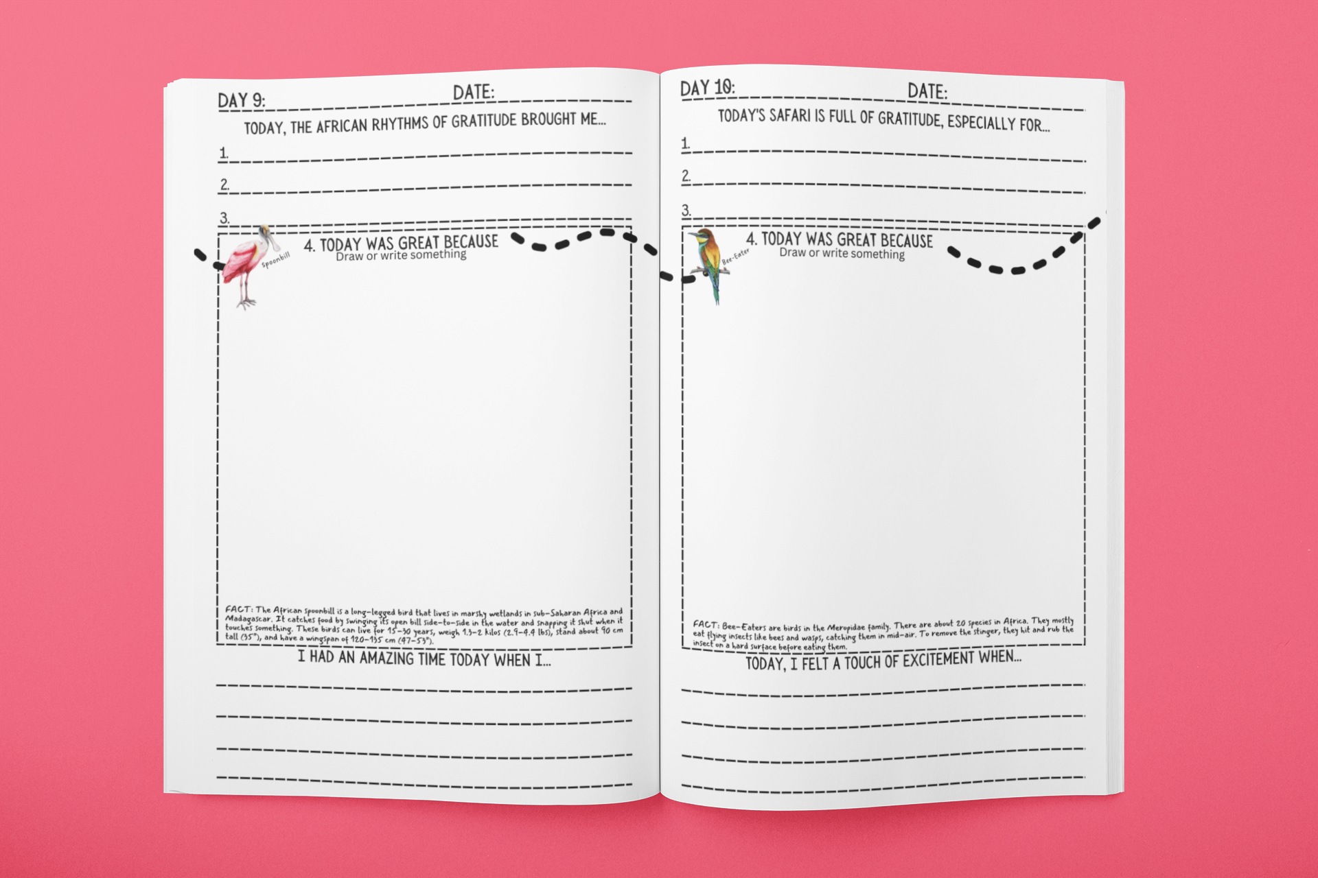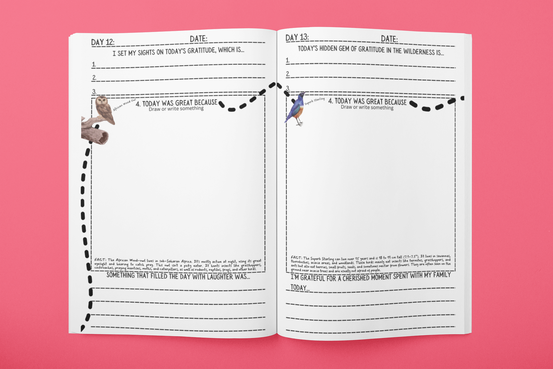 Each day brings fresh and exciting prompts and educational facts about the African Savanna, ensuring that no two days are alike. From recording moments of gratitude to sketching natural wonders and deciphering puzzles, this journal is a gratitude safari adventure!